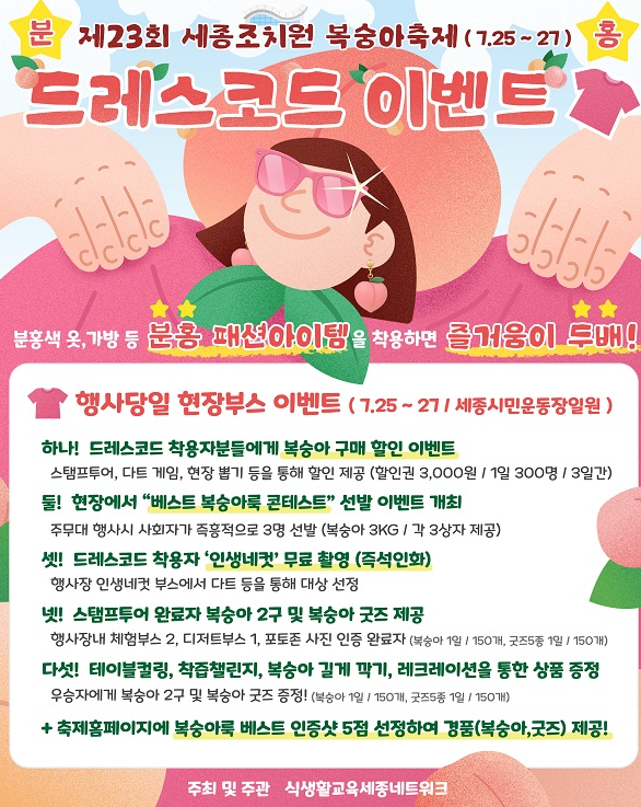 드레스 코드는 분홍색으로 가방, 의상, 머리띠, 텀블러, 신발 등 분홍 아이템으로 맞춰가시면 베스트 복숭아룩선발도 있고 할인 이벤트가 있다고 하니 맞춰서 복숭아 포토존에서 사진도 찍어 보세요!