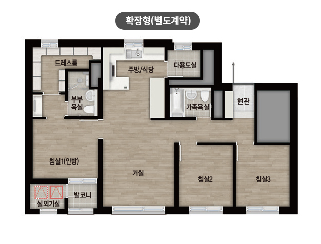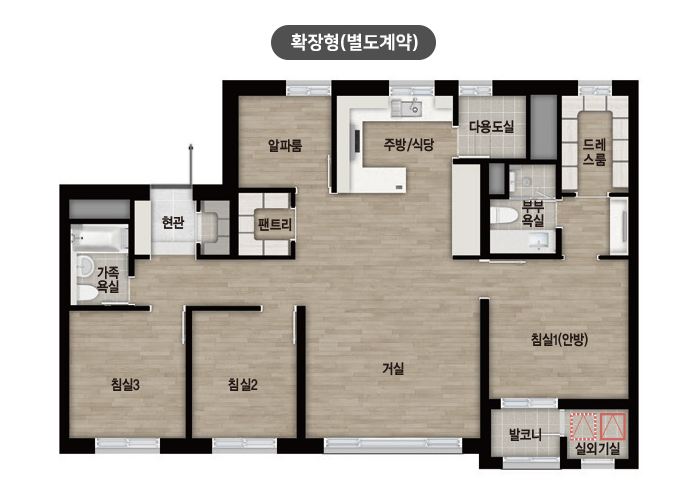 주방 플러스 옵션으로 하면 트여서 더 넓다고 했는데 안 해도 넓어 보일 것 같아요. 알파룸을 가져가서 아이 놀이방이나 서재방, 게임방, 운동방 하면 좋을 것 같아요.